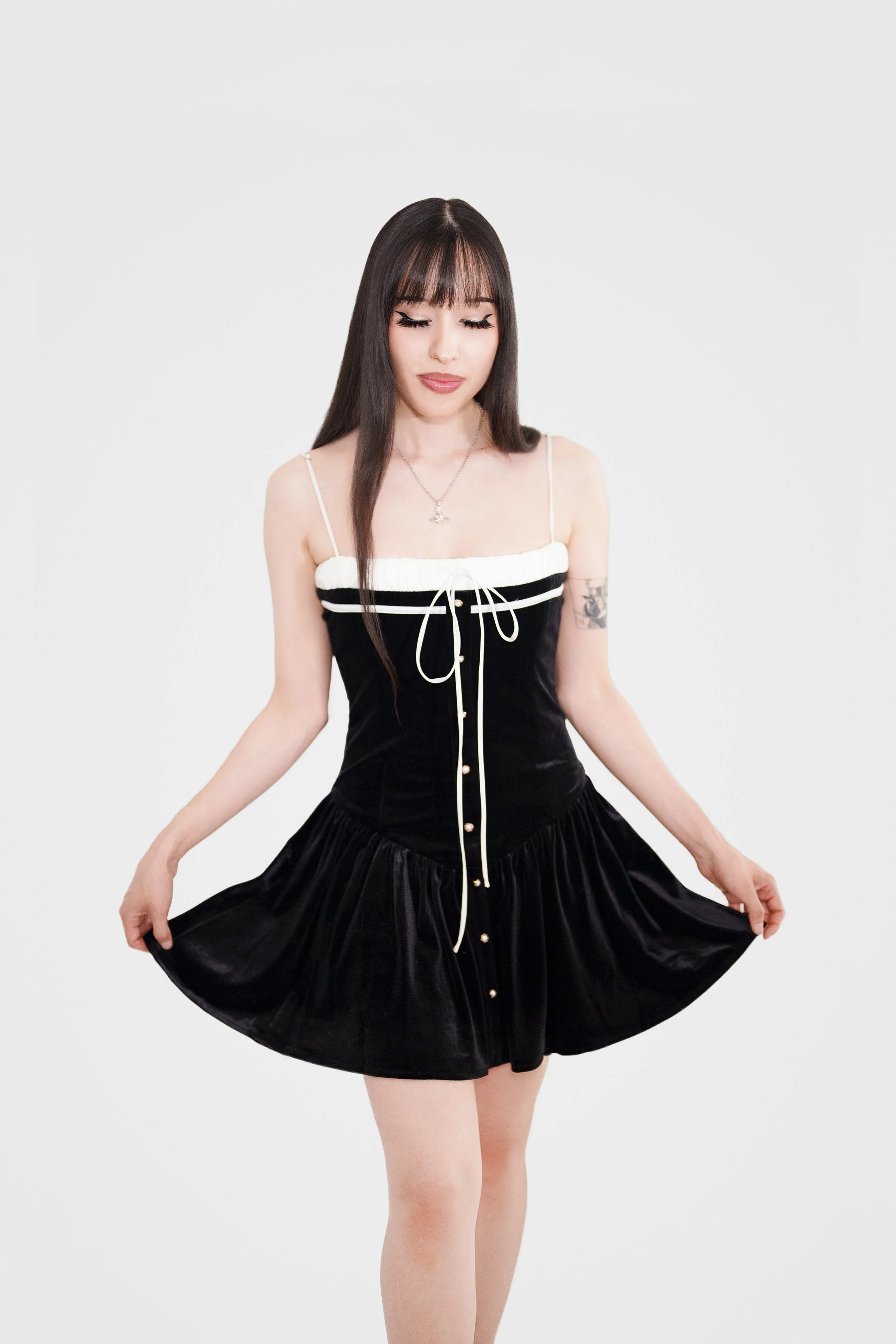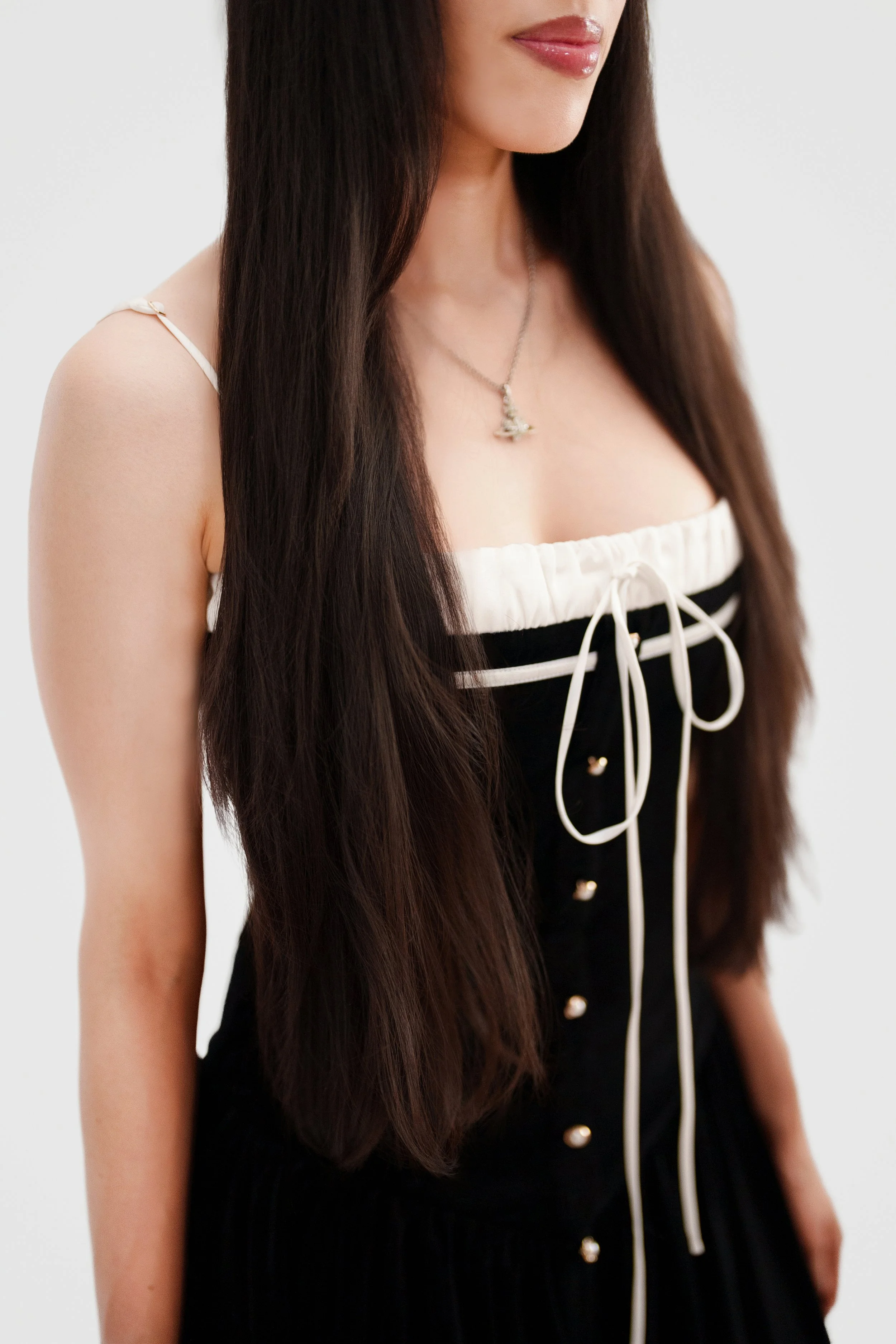 The Modiste Dress features a graceful corset silhouette that accentuates your figure, paired with a flowy skirt that moves with effortless grace. The sumptuous velvet material adds a touch of opulence, while the satin ruched top enhances the dress’s refined charm. Zips up from the back with a hidden zipper.